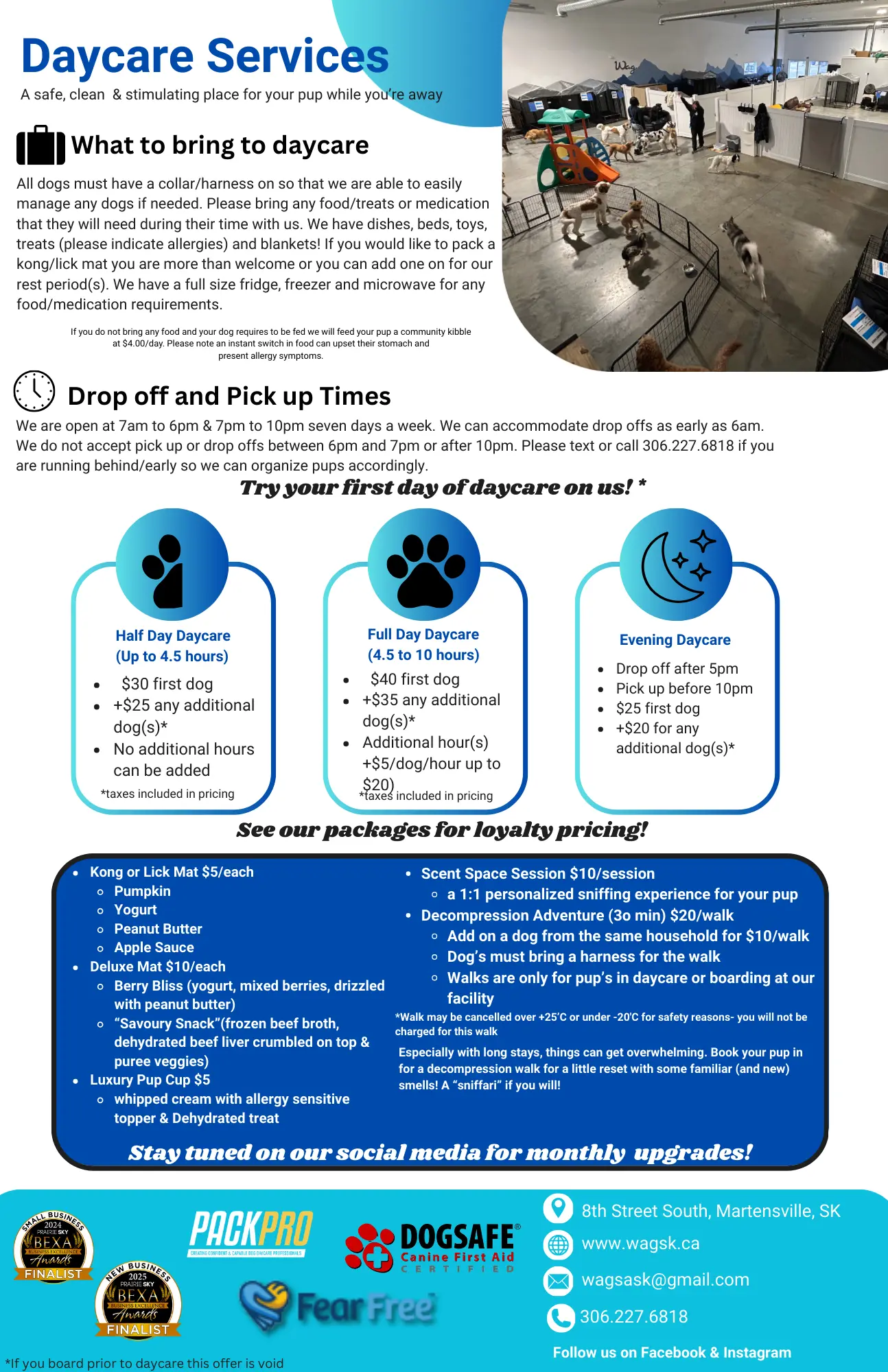 Hours are subject to change based on bookings From 6:00-7:00pm we are closed for a scheduled rest period & supper break. Unless previously arranged, our doors are locked at this time *Please message if your pick up and drop off times change so we can be prepared